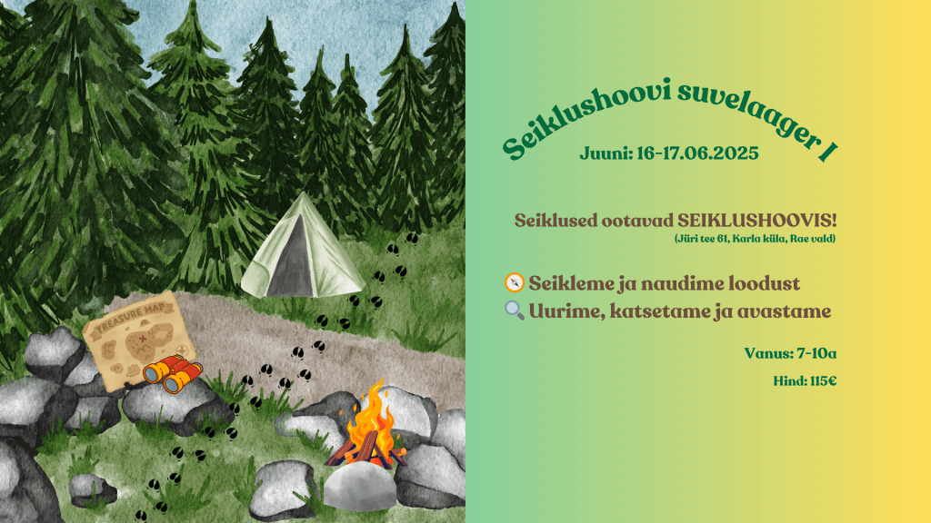 Ootame 7–10-aastaseid lapsi Seiklushoovi suvelaagrisse, kus vaba mäng, loodus ja loovus põimuvad unustamatuks kogemuseks. See on paik, kus laps saab olla laps – uurida, avastada, katsetada ja lihtsalt olla koos uute sõpradega – just nii nagu lapsele omane!