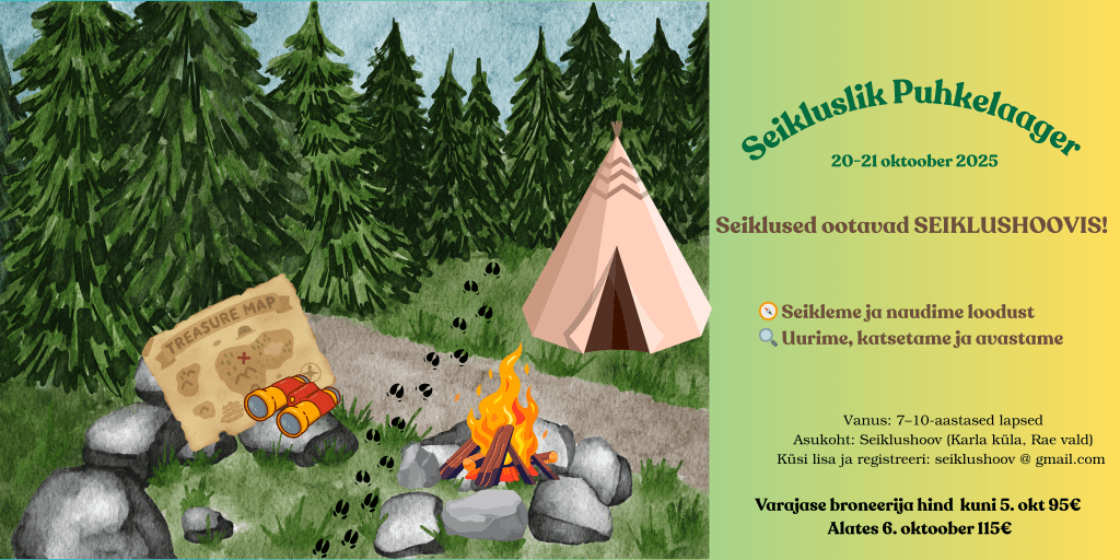 Ootame 7–10-aastaseid lapsi seikluslikule puhkelaagrisse, Laseme laste mõnusalt kooliemotsioonidel kehast välja voolata. Meisterdame, mängime ja seikleme metsas. Programm on planeeritud võimalikult paindlikult, et oleks mõnusalt mänguruumi kulgeda laste huvides ja rütmis.